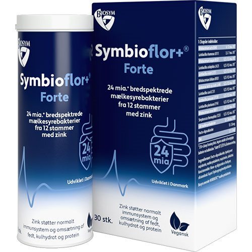 Symbioflor+ Forte med 24 mia. bredspektrede mælkesyrebakterier fra 12 stammer, og indeholder også fructo-oligosakkarider samt zink i kombination.