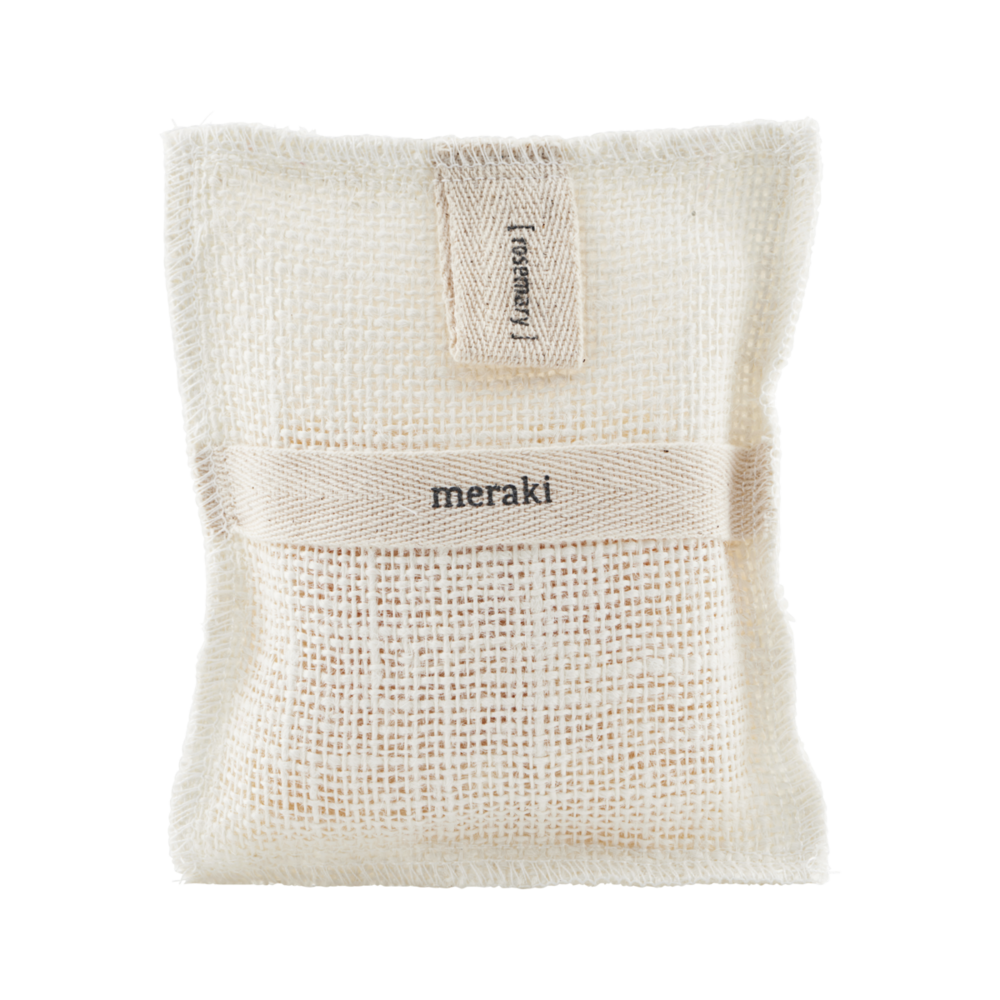Giv huden en nænsom eksfoliering, når man vasker sig med denne lækre badehandske fra Meraki. Badehandsken er lavet af 100% jute og er fyldt med mild, håndlavet sæbe, der skummer op, når man vasker kroppen. Sæben har en skøn duft af rosmarin og indeholder nærende, æteriske olier. Fugt badehandsken med vand, og vask huden i cirkulære bevægelser. Skyl efter med vand.