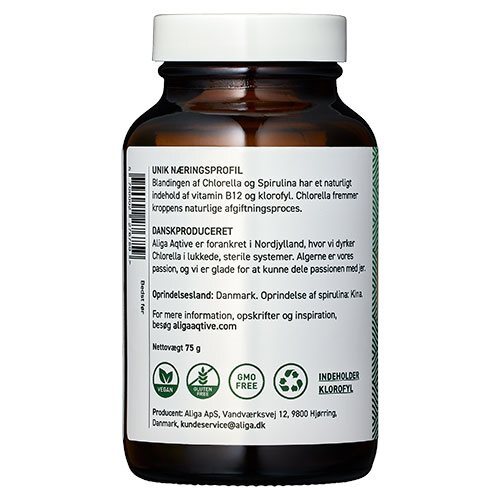 Aliga Aqtives chlorella- og spirulinatabletter har derudover et højt indhold af vitamin B12.