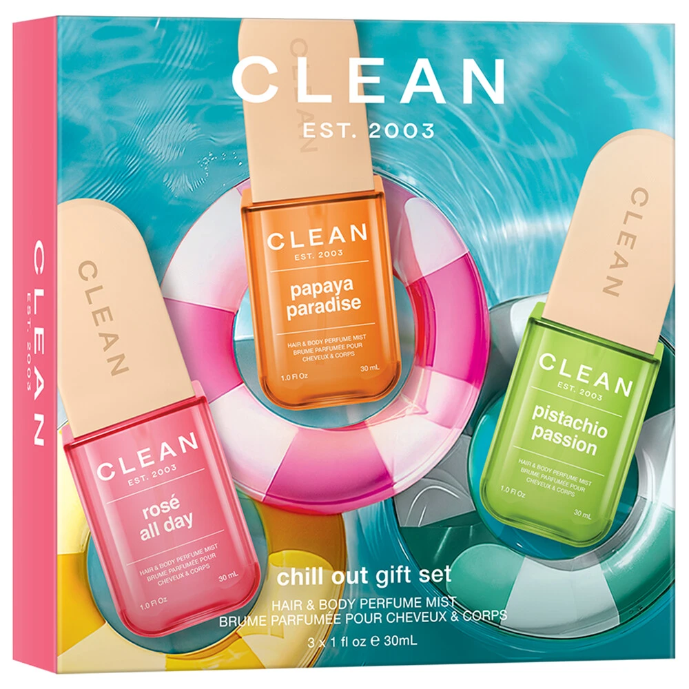 CLEAN Chill Out Gift Set inviterer til solrige dage, afslappende øjeblikke og duftglæde til både krop og hår. Oplev tre sommerlige Hair & Body Perfume Mists i 30 ml – perfekte hver for sig eller kombineret i lag for at skabe din egen unikke duft. Sættet indeholder Rosé All Day, Papaya Paradise og Pistachio Passion, tre uimodståeligt forfriskende og sanselige dufte, der tilsammen indfanger følelsen af endeløs sommer.