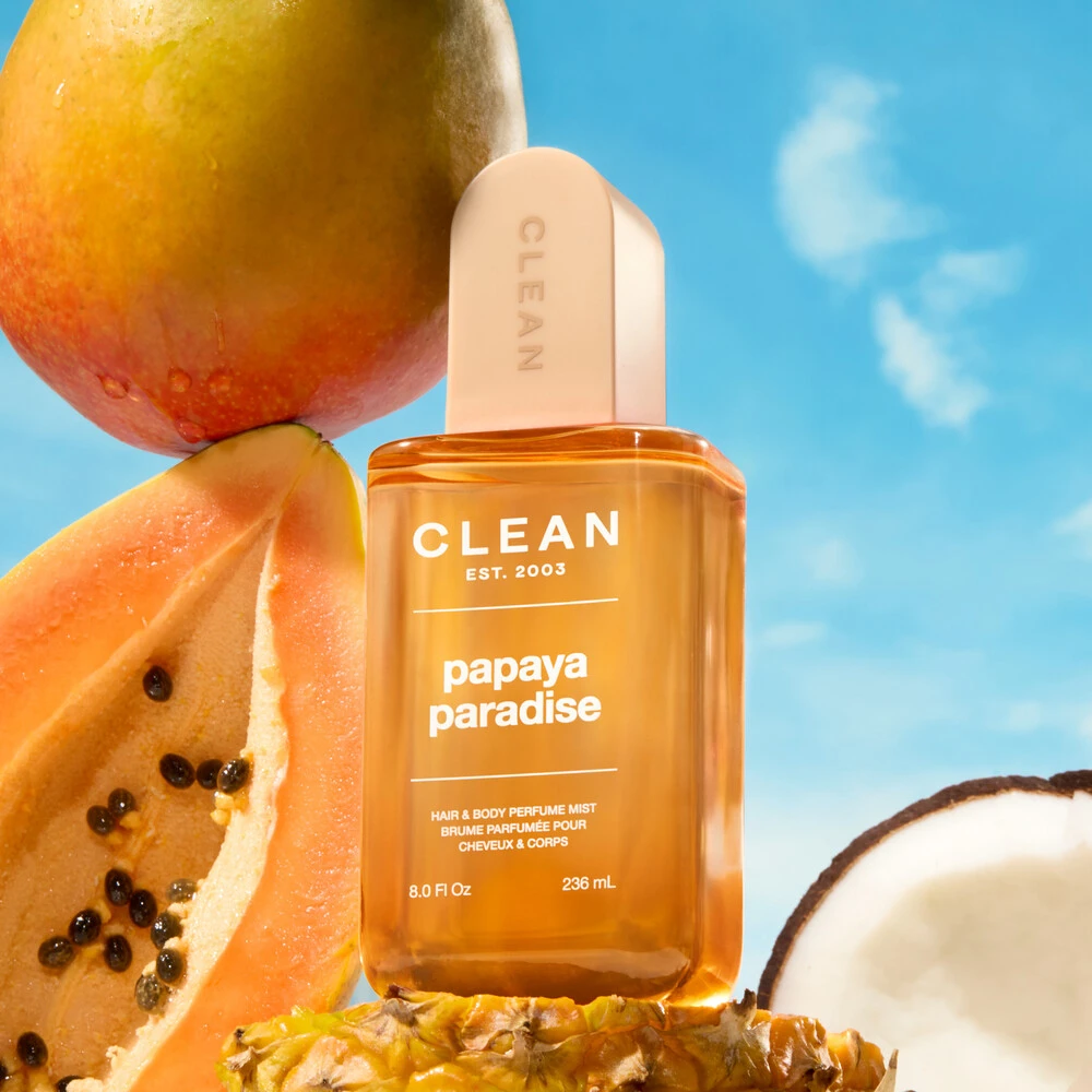 CLEAN Papaya Paradise Hair & Body Perfume Mist indfanger følelsen af uendelig sommer – solrig, blød og tropisk drømmende. Duften åbner med saftig papaya, mango og ananas som leder tankerne hen på en solkysset strand.
