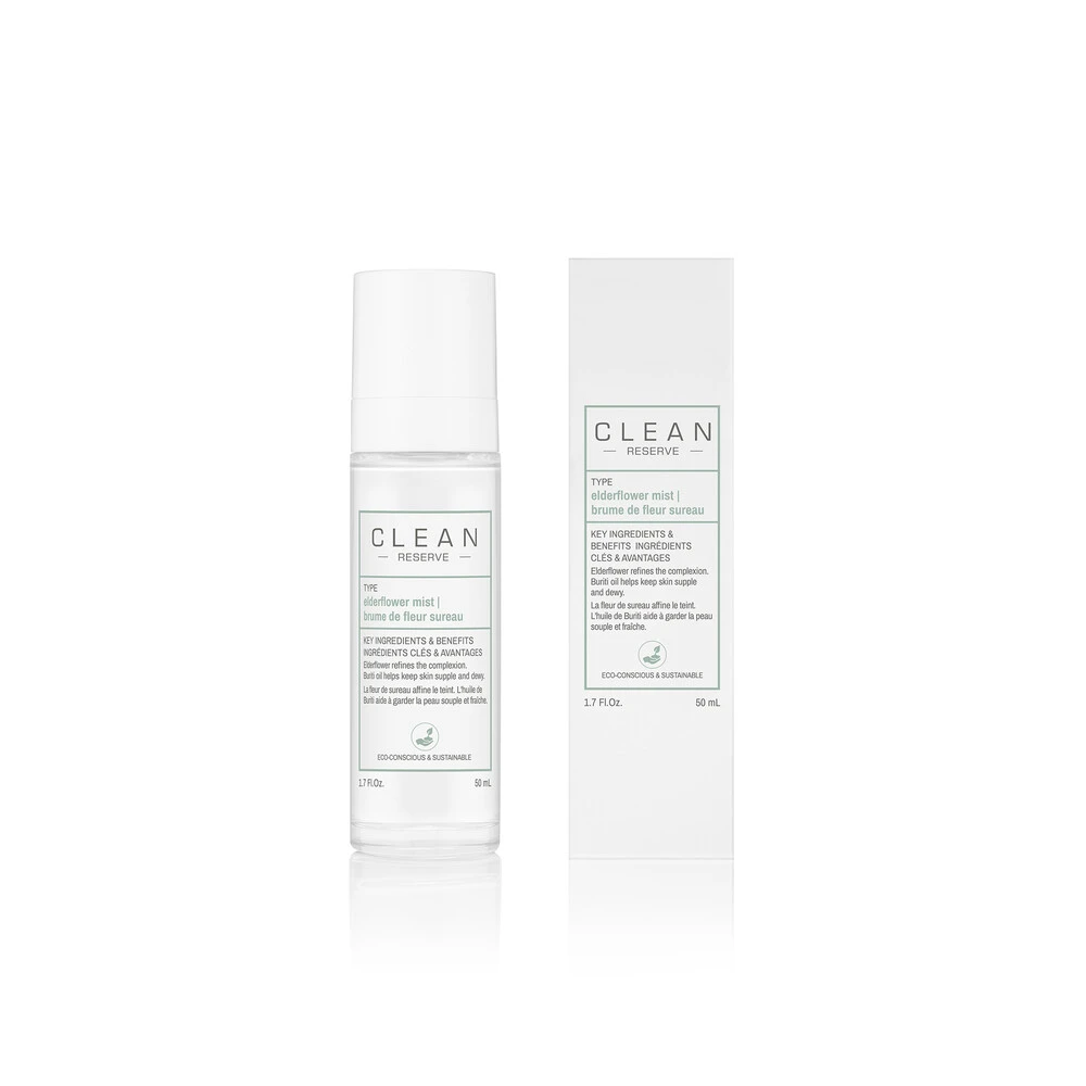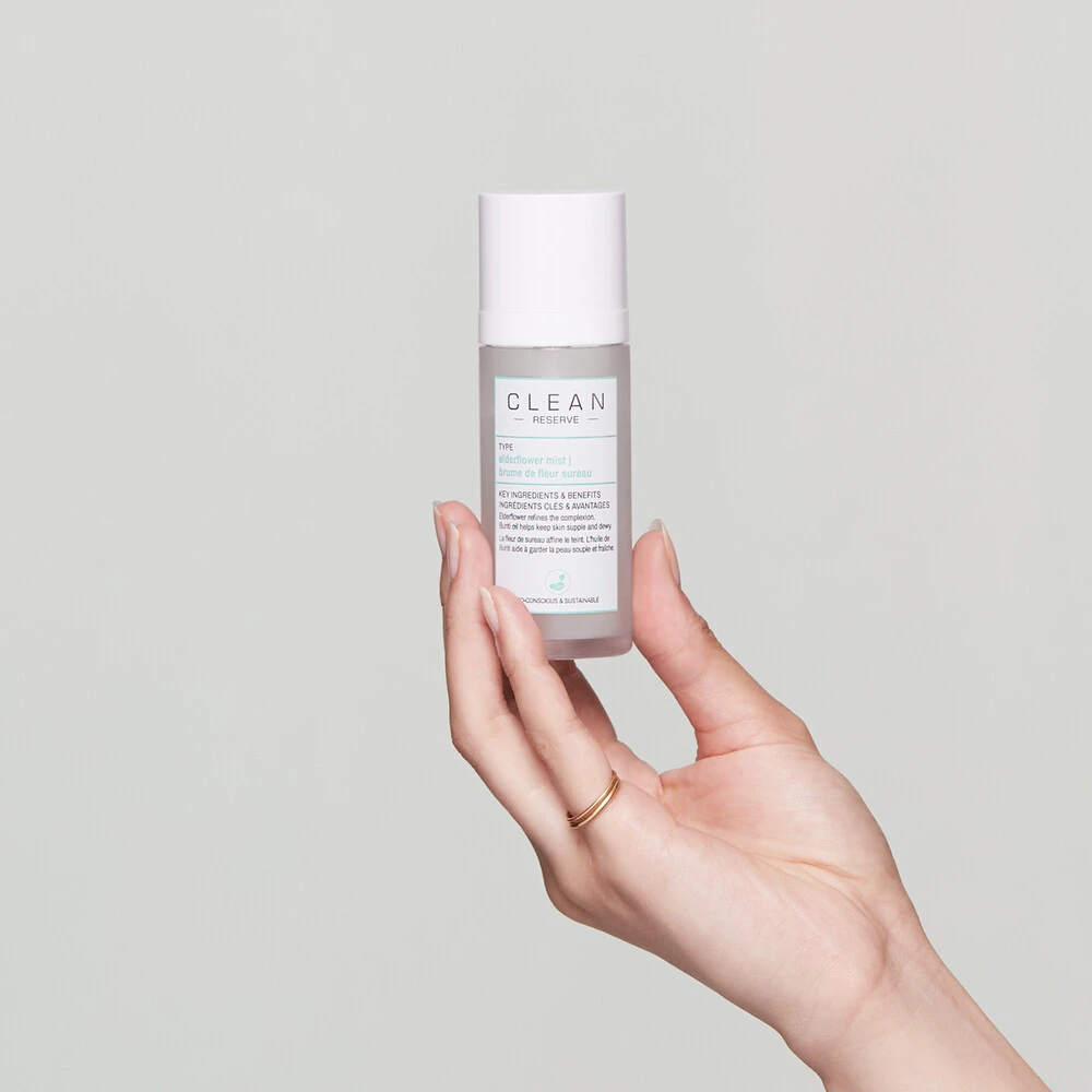 CLEAN RESERVE Elderflower Mist er en multivirkende ansigtsmist, der fugter og balancerer huden, samtidig med at den giver en dugfrisk glød.
