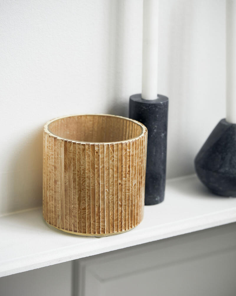 Mirr fra House Doctor er en stor fyrfadslyseholder i gylden mosaik, der tilføjer tekstur og glans til dit hjem. Designet er smukt med et let rillet mønster, som fremstår endnu smukkere, når der tændes lys i stagen.