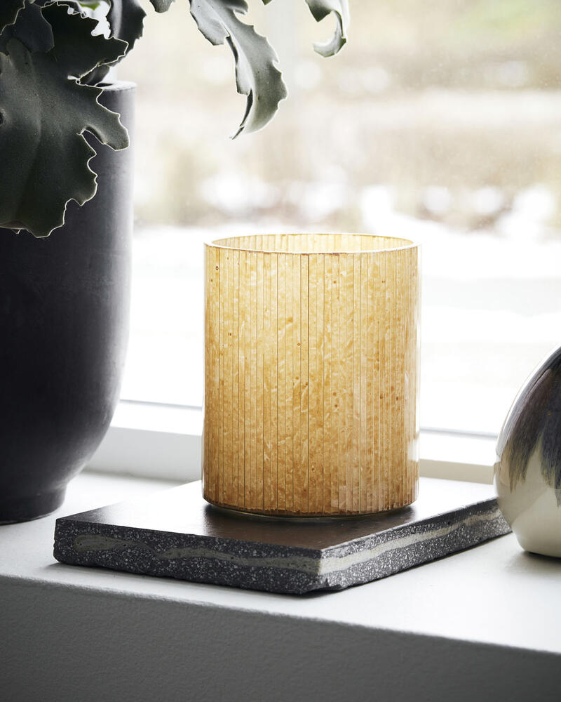 Hvis du vil opdatere din stue, kræves der sjældent en enorm investering. Nogle gange er alt, hvad du behøver, en fyrfadsholder. Mirr fra House Doctor er en stor fyrfadslyseholder i gylden mosaik, der tilføjer tekstur og glans til dit hjem. Designet er smukt med et let rillet mønster, som fremstår endnu smukkere, når der tændes lys i stagen. Sæt den sammen med keramiske vaser og interiør i metal i gyldne nuancer for at få mosaikken til at passe ind eller placér den i vindueskarmen sammen med den mindre Mirr for at fremhæve det vidunderlige mønster. Det er den diskrete detalje, der gør hele forskellen. Finish og farve kan variere.
