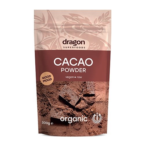 Cacao powder fra Dragon Superfoods, 100% økologisk - til smoothie, på morgenmad, i mælk, kager, konfekt, desserter og andre søde sager.