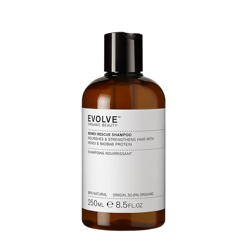Evolves Monoi Rescue Shampoo indeholder den polynesiske skønhedsingrediens Monoi, som hjælper med at forhindre proteintab fra håret og derved nedsætte eventuel skade på håret. Den indeholder også blomstersyre fra hibiscus, som hjælper med at øge cellefornyelsen i hovedbunden, hvilket forbedrer hårets glans og gør det silkeblødt. Den udglatter desuden beskadiget hår og keratinkæder med økologiske syrer og polysaccharider, og reducerer dermed krus. Quinoa-protein booster fugten i håret, og danner en beskyttende barriere, der blokerer miljømæssige stressfaktorer og fastlåser fugt.