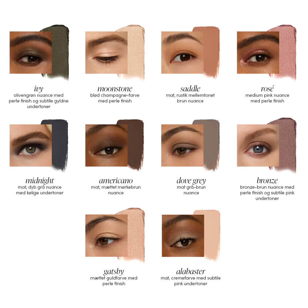 Sådan påføres skyggefarve: Påfør farve på øjenlåget. Blend med fingrene. Påfør flere lag for ekstra intensitet.