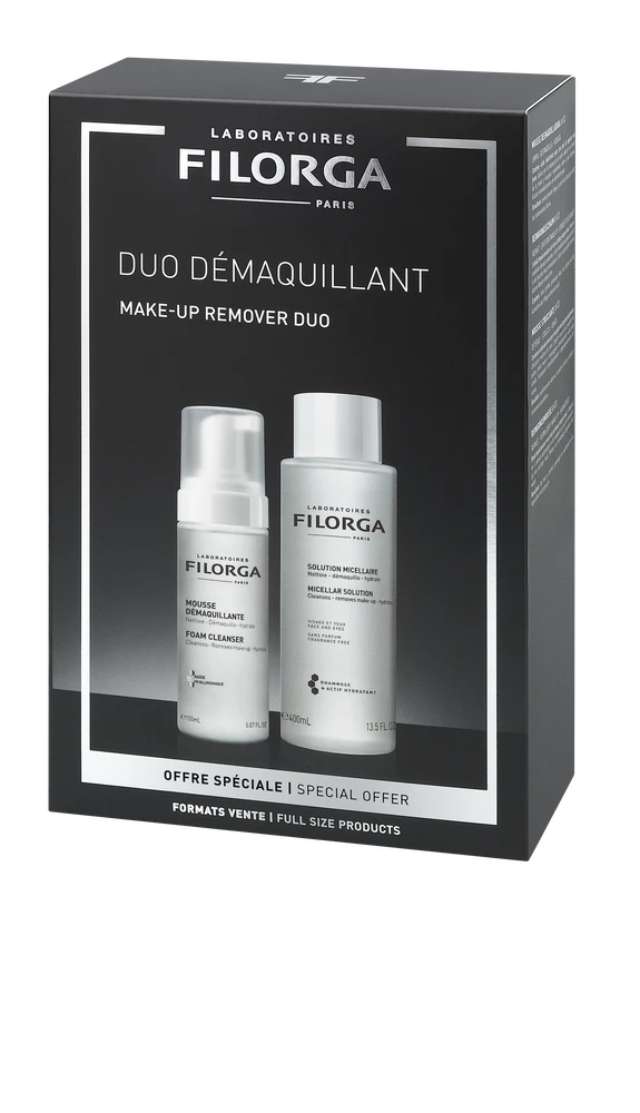 MAKE-UP REMOVER DUO indeholder FILORGAs bedst sælgende renseprodukter FOAM CLEANSER og MICELLAR SOLUTION, som tilsammen renser skånsomt og effektivt, fugter og beroliger.