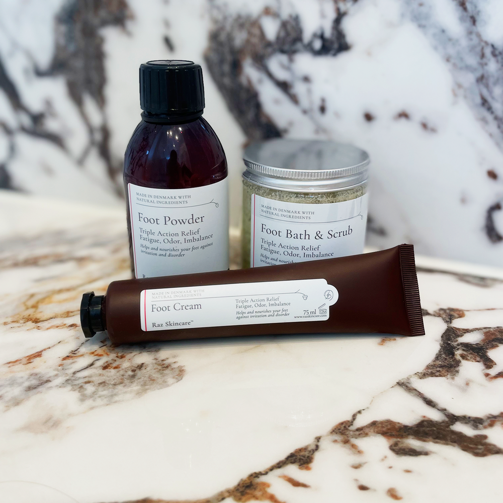 Raz Skincares fodpudder holder dine fødder tørre og hjælper imod irritation, lugt, sved og bakterier.