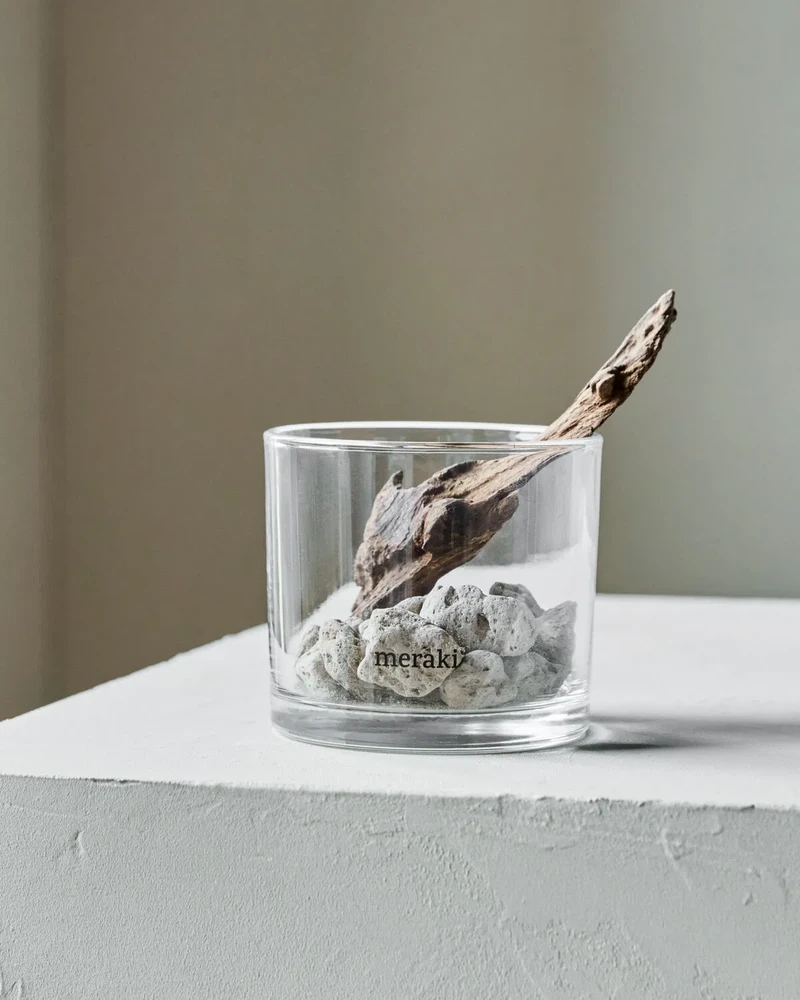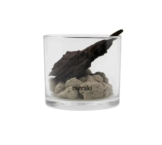 En elegant og naturlig duftspreder med porøse lavasten og drivtømmer i et klart glas. Tilsæt et par dråber æterisk olie på stenene, og lad en behagelig duft sprede sig.