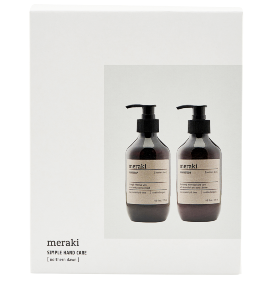 Der findes ikke noget bedre end at forære en gave til en, man holder af. Derfor kan Meraki præsentere den fineste gaveæske med to produkter i duften Northern Dawn. Gaveæsken indeholder en håndsæbe samt en håndlotion, der begge har dufttoner af orange, patchouli og cedertræ. Sammen er produkterne det perfekte kit ved håndvasken. Produkterne kommer i en fin æske med billede af de to produkter.