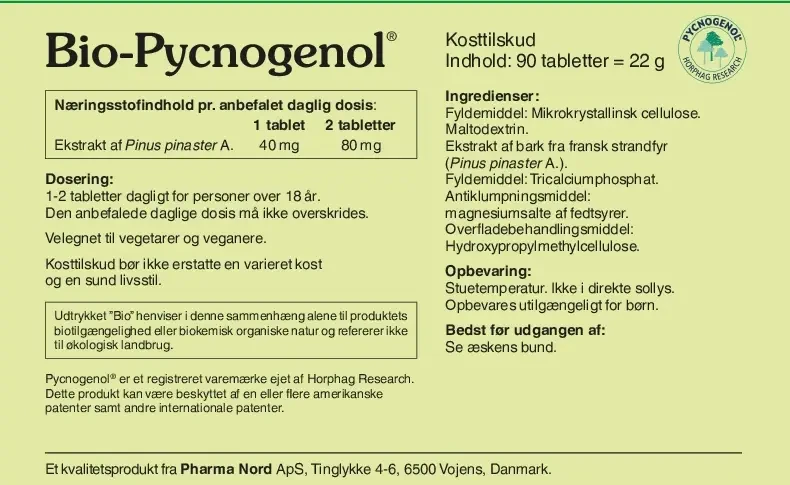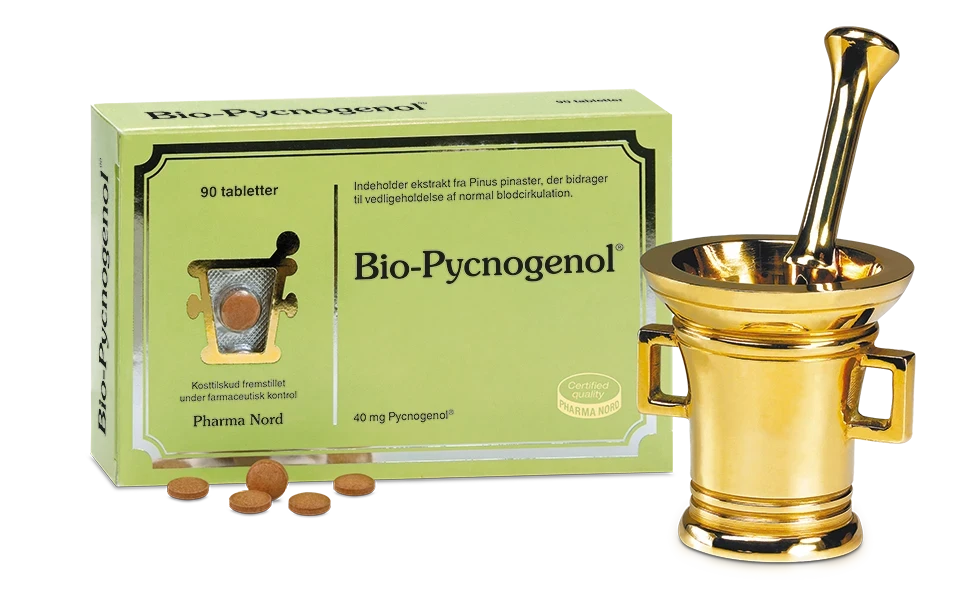 Pycnogenol ingår også som ingrediens i flere kosmetiske produkterBio-Pycnogenol er tabletter med et patenteret rå-ekstrakt af bark fra træet fransk strandfyr (Pinus pinaster Aiton). Hver tablet indeholder 40 mg Pycnogenol-ekstrakt.