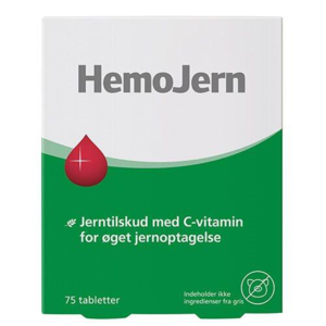 Kosttilskud med Jern og C-vitamin. HemoJern indeholder både hæmoglobinbundet jern (hæmjern) og ikke-hæmjern. Gennem kosten tilføres kroppen normalt begge disse typer af jern. Jernkilderne i HemoJern er ferrobisglycinat og hæmoglobin, og produktet er derfor ikke direkte sammenlignet med andre jerntilskud, der udelukkende indeholder ikke-hæmjern (også kaldet ferroforbindelser). HemoJern er desuden tilsat C-vitamin, som øger optagelsen af jern. Synkevenlig tabletform.