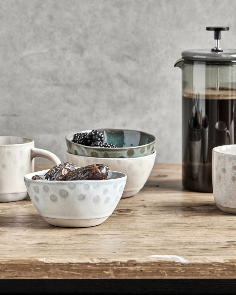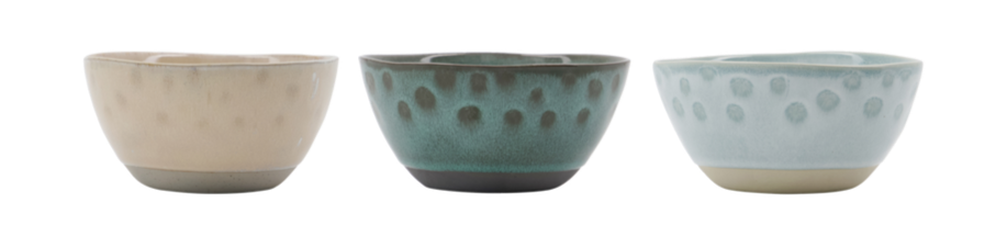 Dette smukke sæt med 3 skåle tilføjer et farverigt touch til dit bord, uanset om du bruger det til morgenmad, suppe, snacks eller hvad som helst derimellem. Med deres slebne bund og håndlavede prikdetaljer skaber disse skåle en afslappet og hyggelig atmosfære. Skålene er håndlavede i stentøj, og hver skål har unikke designvariationer, der forstærker deres charme. Sættet leveres i tre smukke farver: beige, grøn og blå.