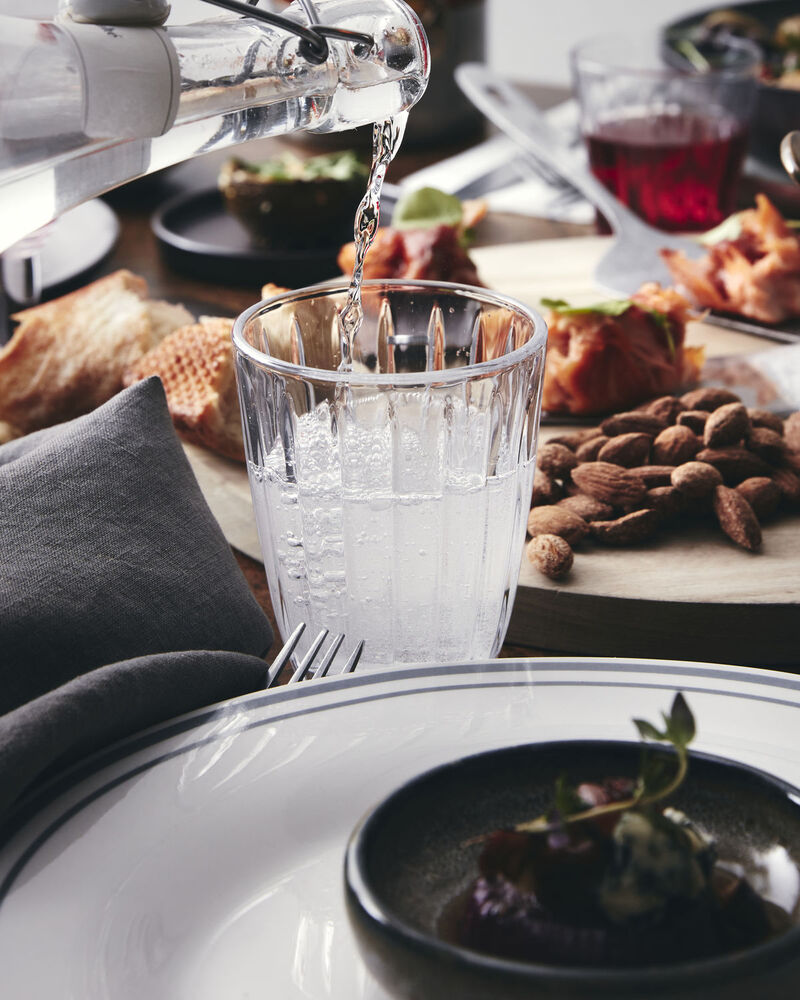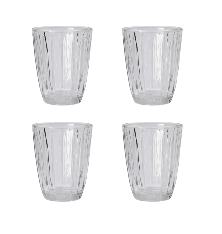 Nyd et koldt glas vand eller brug de fire Groove drikkeglas til et flot, dækket bord. Glassene er riflet og lavet i hånden. Du får et design, som på æstetisk vis forener hverdagsglasset med uformel stil, så det kan bruges både til gæster og til et glas juice om morgenen.