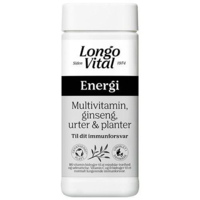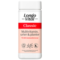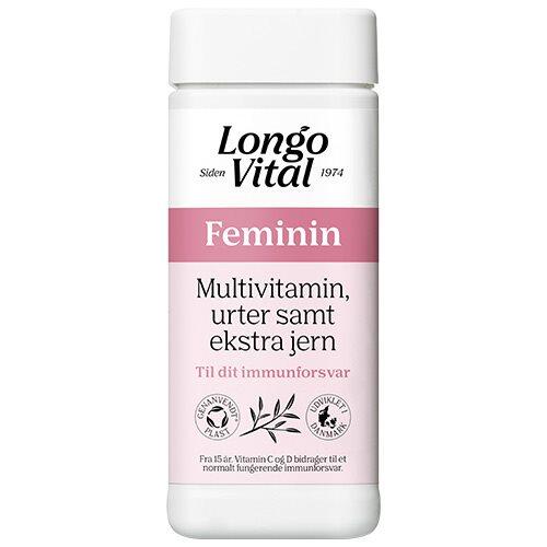 Longo Vital Feminin med urter, vitaminer og mineraler. Med er højt indhold af jern. Til menstruerende kvinder fra 15 år. Vitamin A, B6, C og D bidrager til et normalt fungerende immunforsvar. Jern bidrager til normal dannelse af røde blodlegemer og hæmoglobin samt hjælper til at reducere træthed og udmattelse. Zink, niacin og vitamin A bidrager til opretholdelse af normal hud.