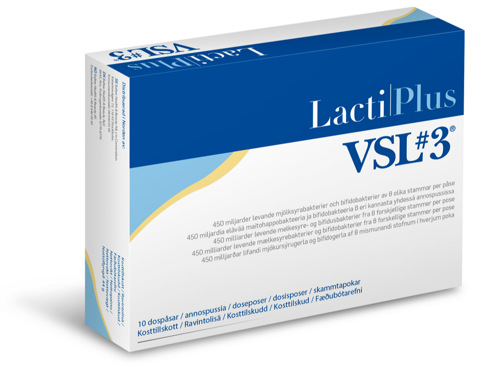 450 milliarder levende mælkesyre- og bifidusbakterier fra 8 forskellige stammer pr. pose. Balanceret, højdosis bredspektrumprobiotika med 450 milliarder levende mælkesyre- og bifidusbakterier fra 8 forskellige stammer og 3 forskellige familier til opretholdelse af mikrobiel diversitet i tarmfloraen. LactiPlus VSL#3 tilfører bakterier som normalt forekommer i mikrobiomet i mavetarmkanalen.
