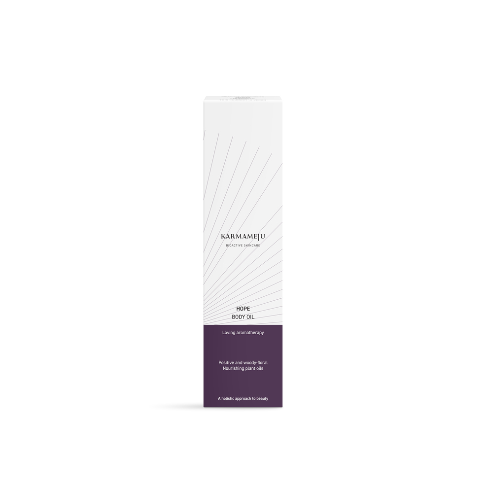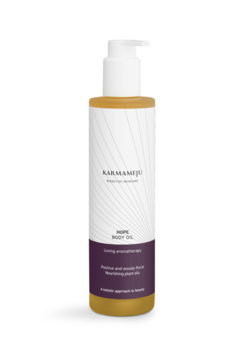 Karmamejus body oil "HOPE" er en feminin og opløftende kropsolie udviklet til at genopbygge tør hud. Nærende E-vitamin, økologisk ekstra jomfru olivenolie og mandelolie, beskytter mod frie radikaler og hjælper med at gøre huden mere spændstig.