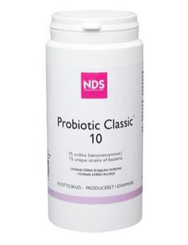 Probiotic Classic 10 med 15 udvalgte levedygtige bakteriestammer i pulverform.