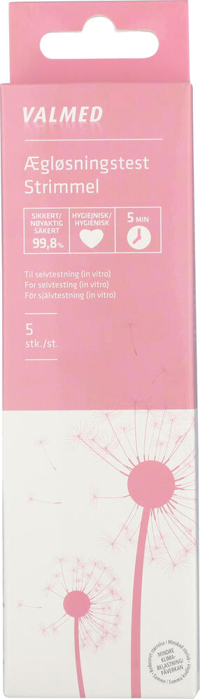 Valmeds ægløsningstest strimmel til hjemmebrug er mere end 99,8 % sikker. Testen måler tilstedeværelsen af hormonet LH (lutein hormon) på 5 minutter.