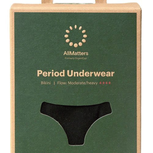 AllMatters menstruationstrusser er tilgængelige i en klassisk sort Bikini trusse i størrelserne XXS-XXXL.