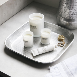 Saml dine parfumer og plejeprodukter på denne aluminiumsbakke fra Meraki. Et håndlavet og sirligt mønster giver denne mellemstore bakke et let udtryk og et strejf af nostalgi.