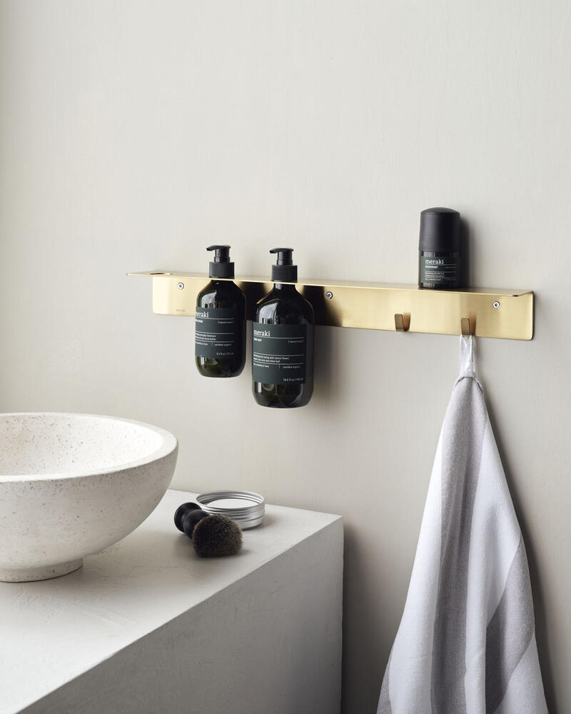 Der er plads til at hænge 3 pumpeflasker op, mens du kan stille produkter eller andet på den lille hylde foroven og desuden opbevare din badesvamp, vaskeklud eller andre accessories på knagerne. Det rustfri stål har fået en elegant finish i børstet messing, som holder vandet ude. Uanset om du hænger holderen fra Meraki op i brusekabinen eller på væggen ved håndvasken, er den med til at opfriske dit badeværelse på elegant vis.
