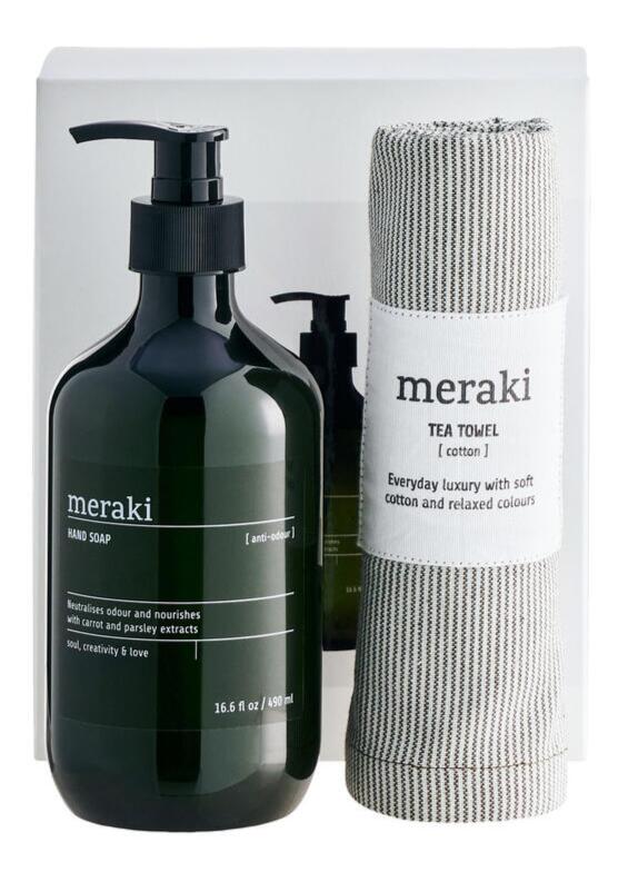 Denne gaveæske er en super værtindegave, selvforkælelsesgave eller andet. Meraki har lavet en gaveæske indeholdende anti-odour håndsæbe med en let duft af mint og blomster samt et smukt og tidsløst viskestykke, lavet af OEKO-TEX® 100 certificeret bomuld.