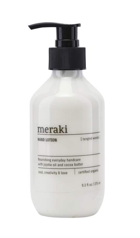 Meraki præsenterer håndlotionen, Tangled Woods, som med sine skønne duftnoter af lavendel, sandeltræ, pebermynte og timian samt enkle design er perfekt til din daglige hudpleje og boligindretning. Tangled Woods er økologisk certificeret og giver dine hænder pleje uden at fedte. Brug den efter du har vasket dine hænder med håndsæbe så du har bløde hænder hele dagen.