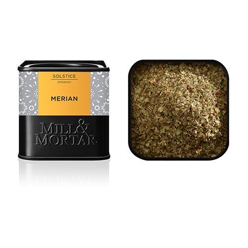 Merian er i familie med oregano og kan anvendes på samme måde. Merian er kendt for sin milde smag med noter af citrus og fyrrenåle, og den spiller fantastisk ind i alt med tomater.