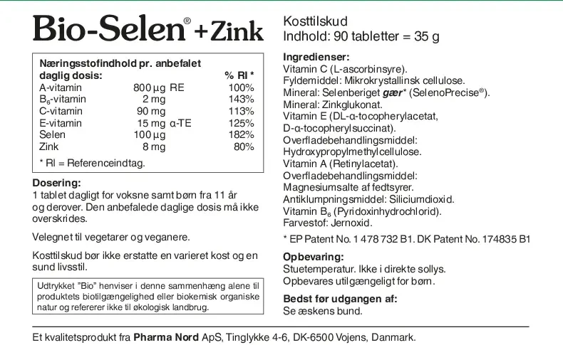 Patenteret, organisk selengær (SelenoPrecise) og zink samt A-, B6-, C- og E-vitamin