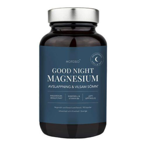NORDBO Good Night Magnesium indeholder af magnesiumbisglycinat, kamille ekstrat og vitamin B6.