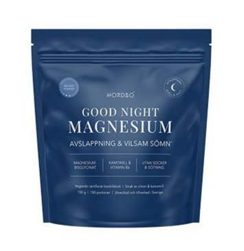 NORDBO Good Night Instant Magnesium indeholder magnesiumbisglycinat, kamille ekstrakt og vitamin B6.