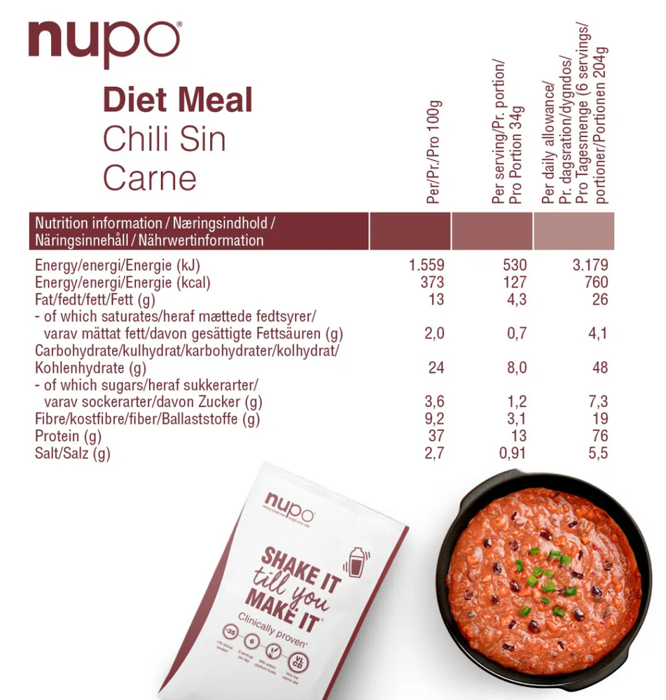 Nupo Diet Meal Chili Sin Carne er en klinisk dokumenteret diæt med et meget lavt kalorieindhold (VLCD), særligt udviklet til at erstatte en fuld dagskost for simpel og let vægtkontrol.