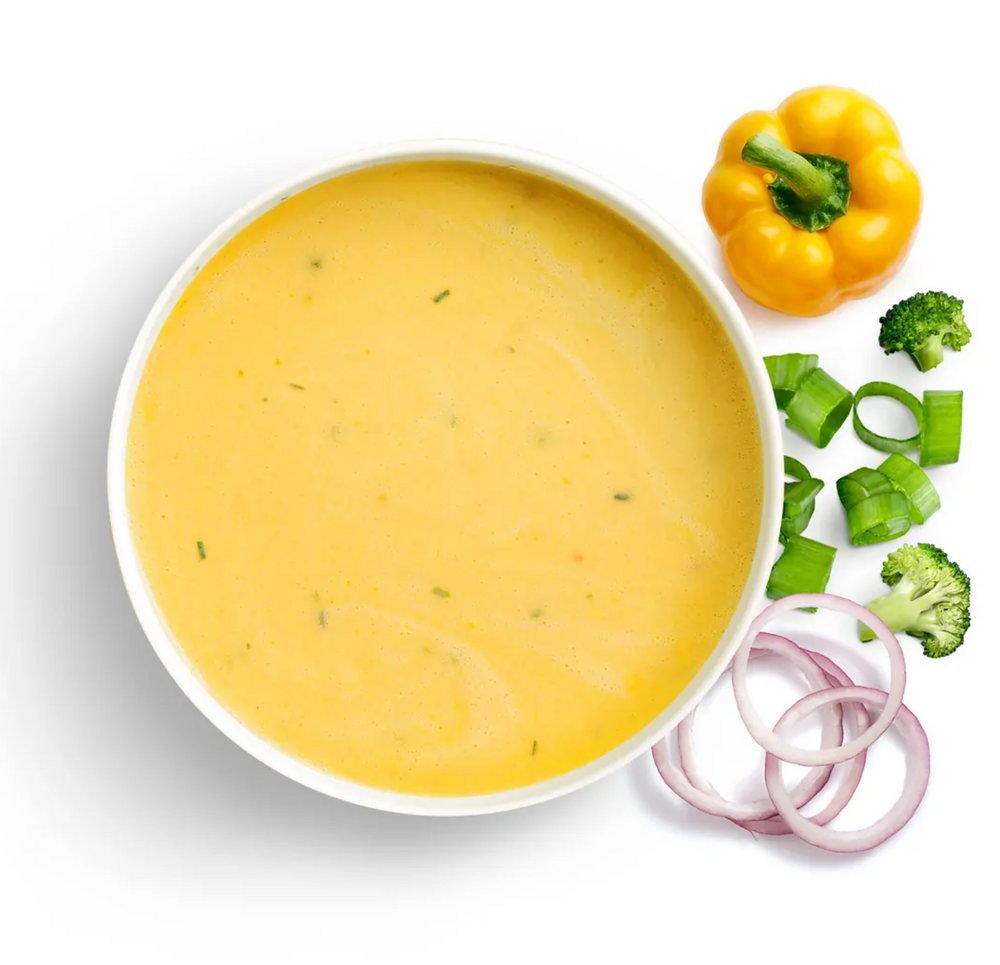 SOJAprotein, skummetMÆLKspulver, polydextrose, SOJAlecithin, modificeret stivelse, vegetabilsk olie (SOJA), mineraler (kaliumchlorid, calciumsalte af orthophosphorsyre, magnesiumcitrat, zinksulfat, ferripyrophosphat, manganosulfat, cuprisulfat, kaliumjodid, natriumselenit, natriummolybdat) og vitaminer (L-ascorbinsyre, nicotinamid, DL-alpha- tocopherylacetat, calcium-D-pantothenat, riboflavin, pyridoxinhydrochlorid, thiaminmononitrat, beta-caroten, pteroylmonoglutaminsyre, phylloquinon, D-biotin, ergocalciferol, cyanocobalamin), aroma, løgpulver (3,8%), salt, MÆLKeprotein, fortykningsmidler: cellulosegummi; psyllium-frøskaller pulver (0,1%), paprika (0,4%), broccoli (0,4%), porre (0,3%), farvestof: karotener. For allergener, se ingredienser med store bogstaver og fed skrift.