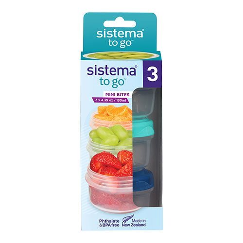 Mini Bites To Go, 3 pak - smart lille bøtte (130 ml) til f.eks. nødder, rosiner, majs, pastiller til at tage med på farten. Findes som 3 pak i farverne pink, purple og blue.