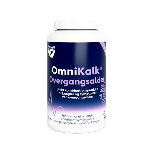 OmniKalk Overgangsalder kombinerer de bedste ingredienser fra naturen for at hjælpe kvinder i overgangsalderen med at opnå symptomlindring. Produktet indeholder 600 mg letoptageligt og organisk bundet calcium samt 250 mg magnesium fra kilden AlgaeCal. Kvinder der træder/er trådt ind i overgangsalderen mister hurtigere knoglemasse. Derfor har Biosym valgt en calciumkilde, som har fokus på letoptageligt calcium. Calcium hjælper nemlig med at begrænse tabet af knoglemassen hos kvinder i/efter overgangsalderen.