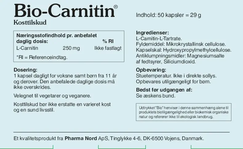 Bio-Carnitin er vegetabilske kapsler med 250 mg ren L-carnitin i hver. Fremstillingen af Bio-Carnitin foregår under farmaceutisk kontrol og efter GMP-protokollen, og Pharma Nord garanterer for kvaliteten. Carnitinen i Bio-Carnitin er fremstillet ved hjælp af en unik fremstillingsproces baseret på gæring. Denne metode, der bærer kvalitetsmærket Carnipure™, gør det muligt at fremstille L-carnitin på samme måde som i naturen. Resultatet er ren, naturidentisk L-carnitin uden rester af D-carnitin.