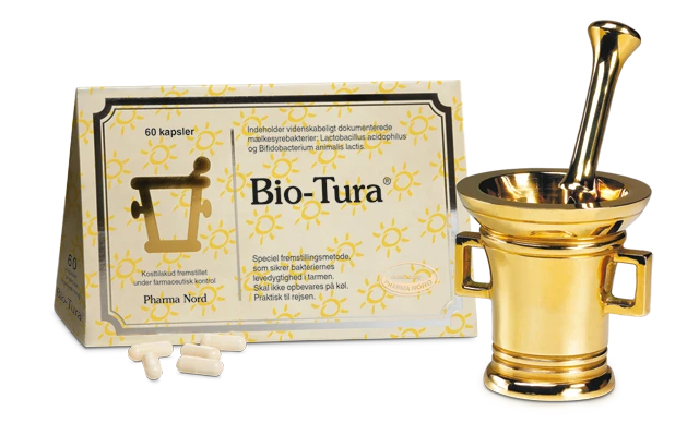 De to typer af mælkesyrebakterier i Bio-Tura forekommer naturligt som en del af vores miljø af bakterier i tarmen. Bio-Tura-kapsler med Lactobacillus acidophilus La-5® og Bifidobacterium lactis BB-12® er særligt nyttige på ture til områder af verden, hvor man er udsat for en fremmed bakterieflora. De er stabile ved stuetemperatur. Start med kapslerne et par uger før afrejsen.