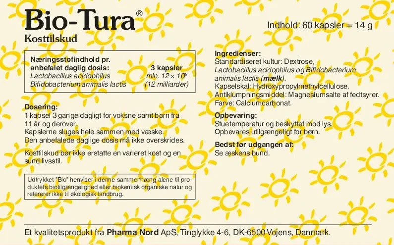 Mælkesyrebakterie af typen Lactobacillus acidophilusBio-Tura består af små, vegetabilske kapsler med probiotika, det vil sige venlige tarmbakterier. Hver kapsel indeholder 4 milliarder levende bakterier opdelt i to stammer af mælkesyrebakterier af typen: Lactobacillus acidophilus (La-5®) og Bifidobacterium lactis (BB-12®). Kapslernes størrelse gør dem lette at sluge.