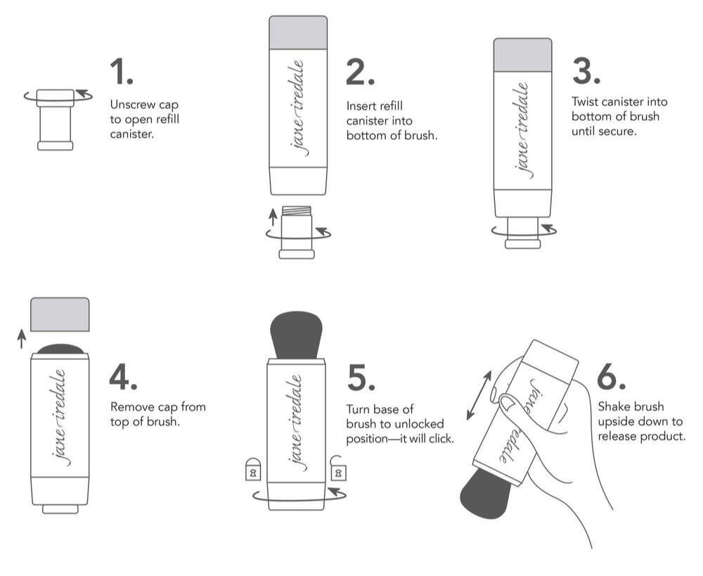 Påfør den lette pudder i flere lag på fugtet hud, så pudderen kan klæbe ordentligt fast på huden. Skru hætten af for at åbne refillen. Indsæt refillen i bunden af børsten. Skru refillen indtil den sidder fast. Tag hætten af børstens top og drej børstens bund til ulåst position - den skal klikke. Ryst børsten et par gange på hovedet for at få pudderet til at strømme igennem. Påfør generøst på krop, ansigt og hovedbund for solbeskyttelse. Drej børstens bund til låst position og påsæt hætten for sikker opbevaring on-the-go.