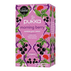 Pukkas økologiske Morning Berry te, er skøn at nyde om morgenen. Sprængfyldt med søde solbær, saftige brombær og forfriskende hibiscus, komplimenteres de frugtagtige smage af rooibos, rosmarin og ginseng.