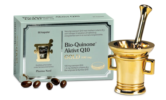 Q10-gelatinekapslerBio-Quinone Aktivt Q10 GOLD består af bløde gelatinekapsler med Q10 i form af 100 mg aktivt ubiquinon opløst i vegetabilsk olie. Kapslerne indeholder 1,4 mg riboflavin (vitamin B2) og er desuden lysforseglede. Præparatet har igennem flere årtier været verdens mest udbredte Q10-brand, hvilket hænger sammen med, at det er i stand til at dokumentere en høj optagelighed.
