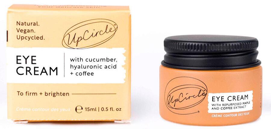 Øjencremen er lavet med fugtende hyaluronsyre, kølende agurk, lysnende kaffeolie ekstraheret fra genbrugskaffegrums, og anti-inflammatorisk ahornbarkekstrakt - et biprodukt fra træindustrien.