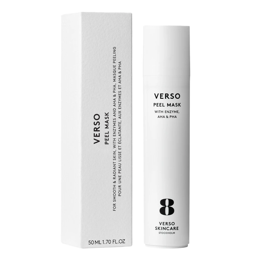 Verso Peel Mask er en eksfolierende ansigtsmaske, der effektivt løsner og fjerner gamle hudceller fra hudens overflade og optimerer effekten af den efterfølgende hudplejerutine. Eksfolierende syrer (AHA og PHA) samt granatæbleenzymer modvirker tilstoppede porer og giver en synligt glattere, silkeblød hud. Hudtonen bliver mere jævn, klar og strålende, og ved regelmæssig anvendelse reduceres forekomsten af fine linjer og rynker. Maskens AHA'er (glykol- og mælkesyre) giver hurtige resultater og skånsom eksfoliering, mens den kraftige antioxidant PHA (gluconolactone) fugter huden og genopretter dens fugtbalance. Granatæbleenzymet giver ny friskhed og udstråling til træt og livløs hud, samtidig med at hudens tone og spændstighed forbedres.