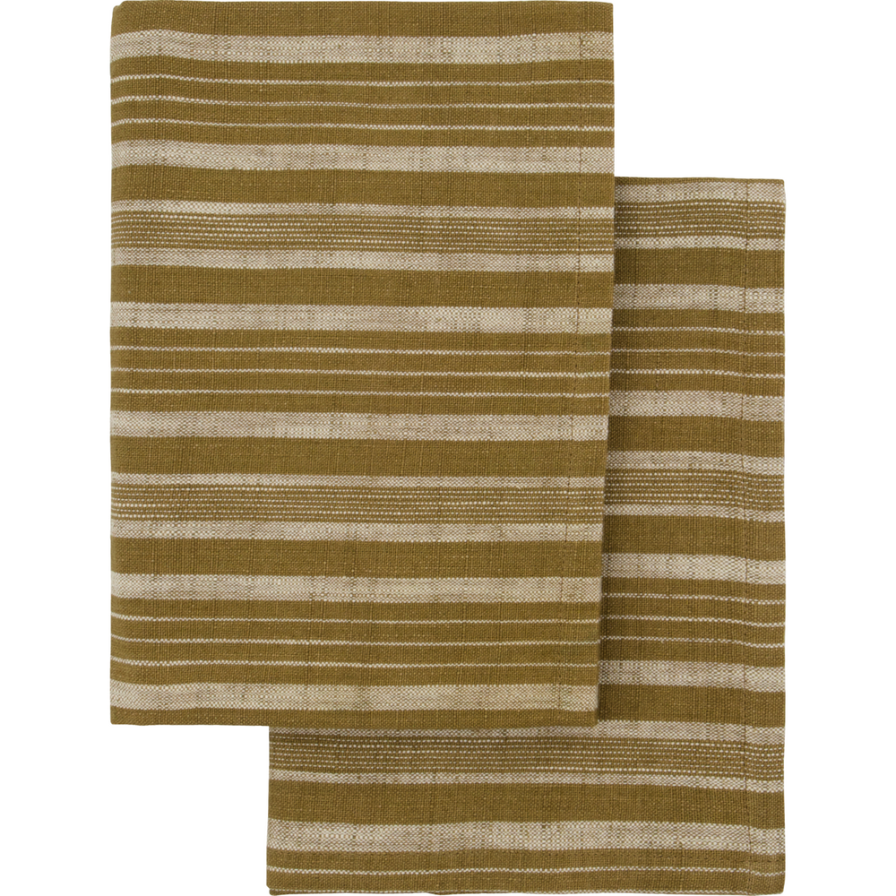 Opgrader dit køkken med et strejf af naturlig elegance. Dette sæt indeholder to viskestykker i en nutidig mørk og lys olivenstribet nuance, fremstillet i blød og Oeko-Tex-certificeret bomuld – din garanti for både kvalitet og komfort.