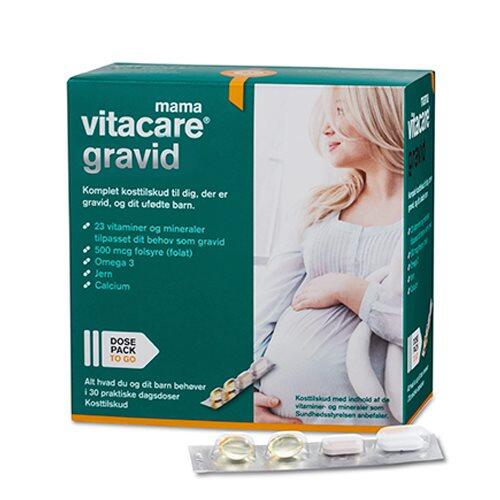 Vitacare mama Gravid er et 'alt-i-et' produkt med præcis de næringsstoffer, du og dit barn har brug for. Med Vitacare mama Gravid får du 13 vitaminer og 10 mineraler i mængder, som er tilpasset dit behov som gravid. Derudover får du calcium samt Omega 3, der indeholde de vigtige fedtsyre DHA og EPA. Pakket i en praktisk dagsdosis - lige til at tage med på farten.