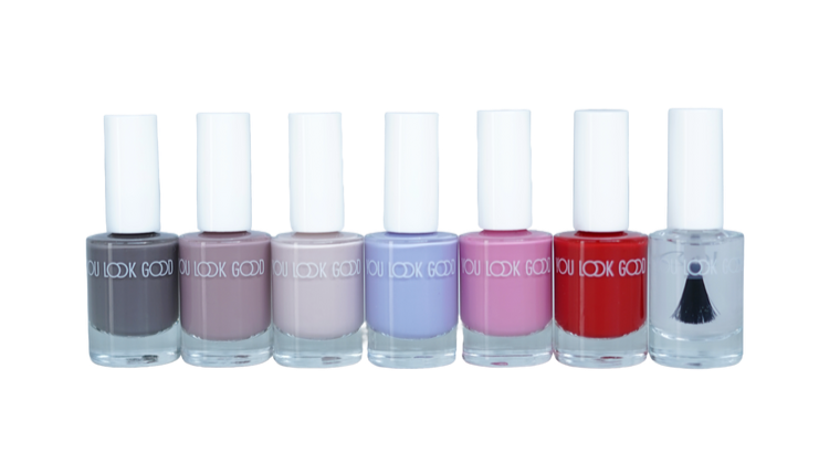 You Look Good har også lavet neglelak, der er en rigt pigmenteret lak, der giver neglene et overdådigt, glossy look med en holdbarhed på op til 7 dage (ved brug af base/top coat). Formularen giver en stærk, brud-resistent overflade, og er nem at påføre med den buede applikator og tørrer i løbet af få minutter.